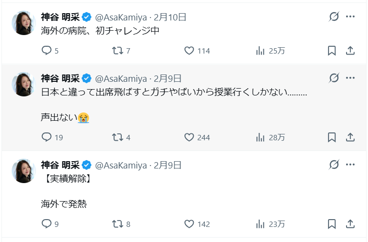 もう少し神谷さんの投稿をたどると、どうやら飛行機に乗る前々日に発熱していたよう。