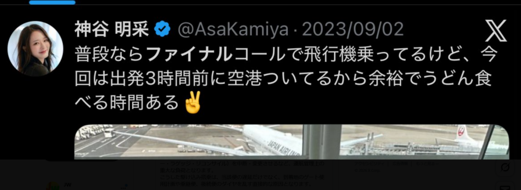 2023年に「普段ならファイナルコールで飛行機乗ってるけど」という投稿も確認されており、本当にファイナルコール常連のようです。