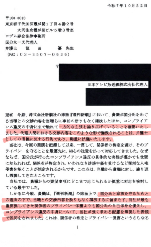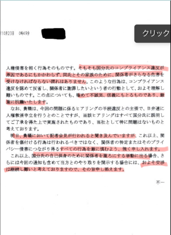 国分太一さんが人権救済の申し立てを行うとなったときに日テレ送ったFAXとのこと。