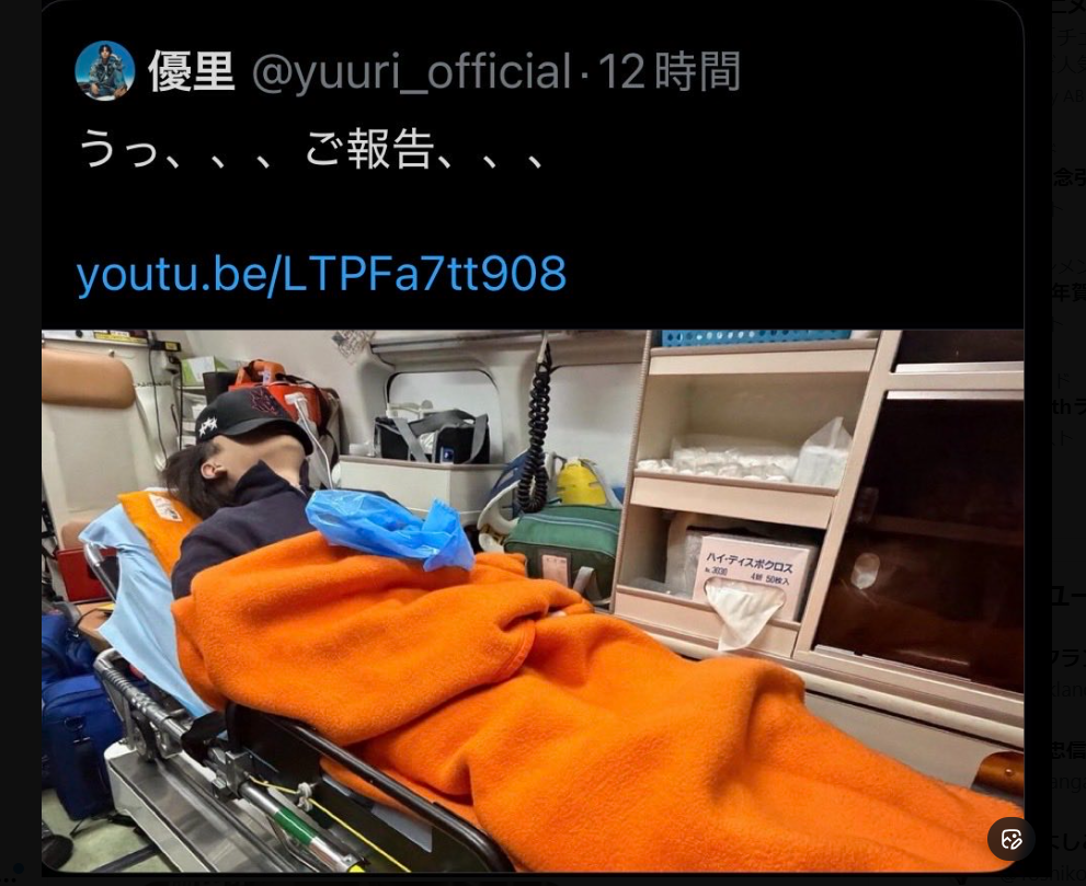 [画像]優里が救急搬送をSNS投稿、炎上、削除!プロ意識ない?